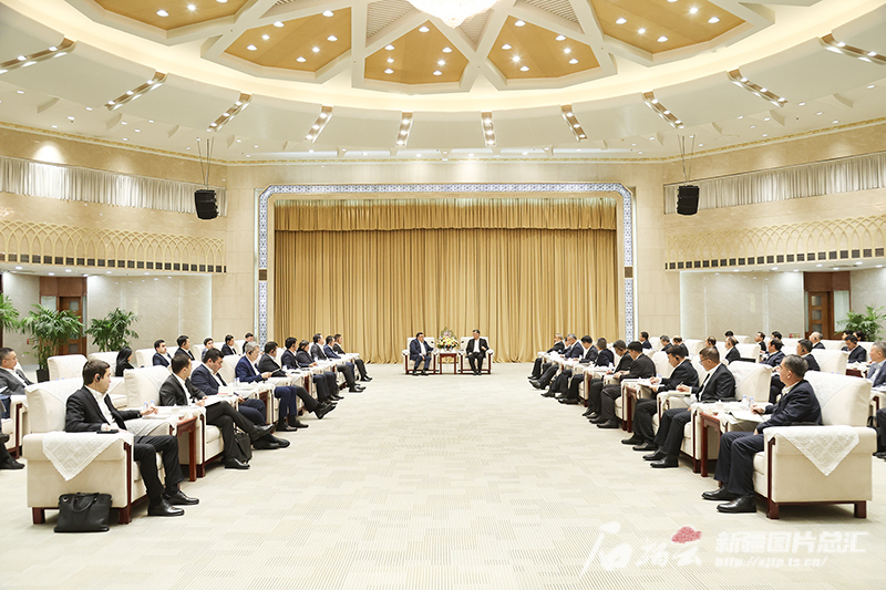 12月13日,自治区党委书记马兴瑞、自治区主席艾尔肯·吐尼亚孜在乌鲁木齐会见乌兹别克斯坦投资、工业和贸易部副部长卡西莫夫率领的政府部门代表团一行。石榴云/新疆日报记者谢龙摄