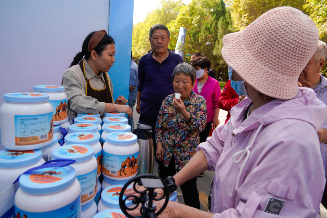 市民正在品尝驼奶粉。融媒体中心记者魏国能摄