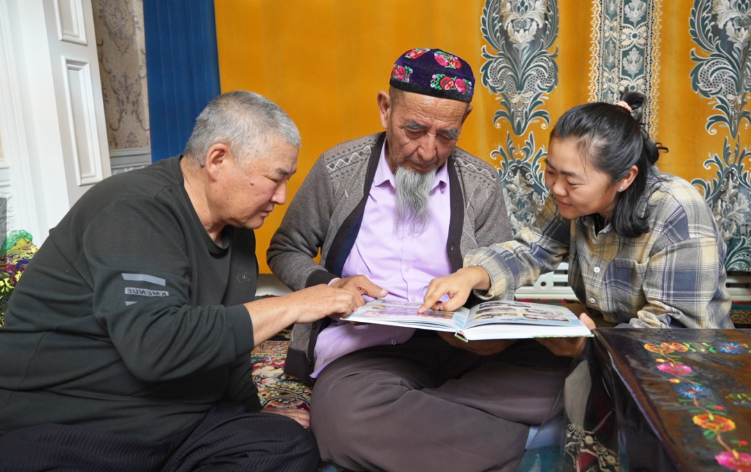 吴玉甫·萨依木(中)翻看相册里的老照片,讲述了当时的往事。受访者提供