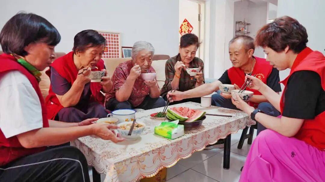 “阿牙社区志愿帮帮团红石榴小组”成员照顾高龄独居老人用餐。资料图片,伊州区融媒体中心记者于斌摄