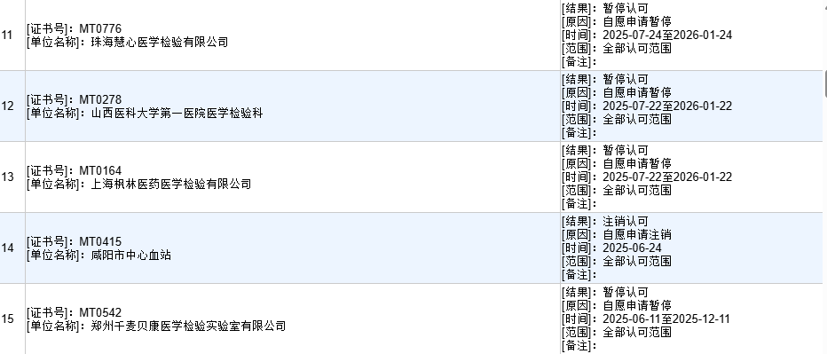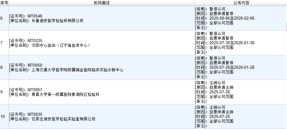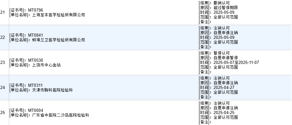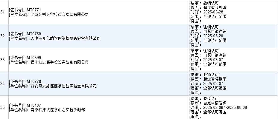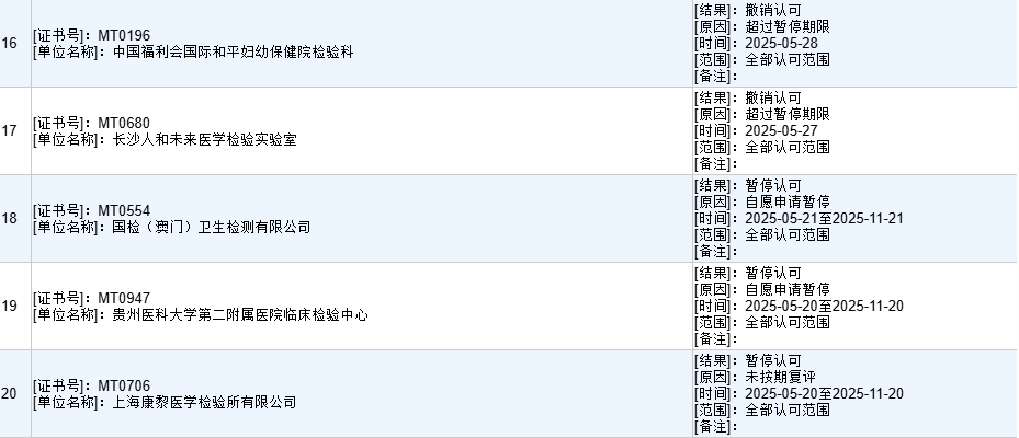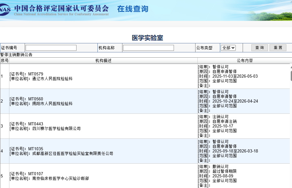 以下是今年医学实验室暂停/注销/撤销CNAS认可的详细情况: