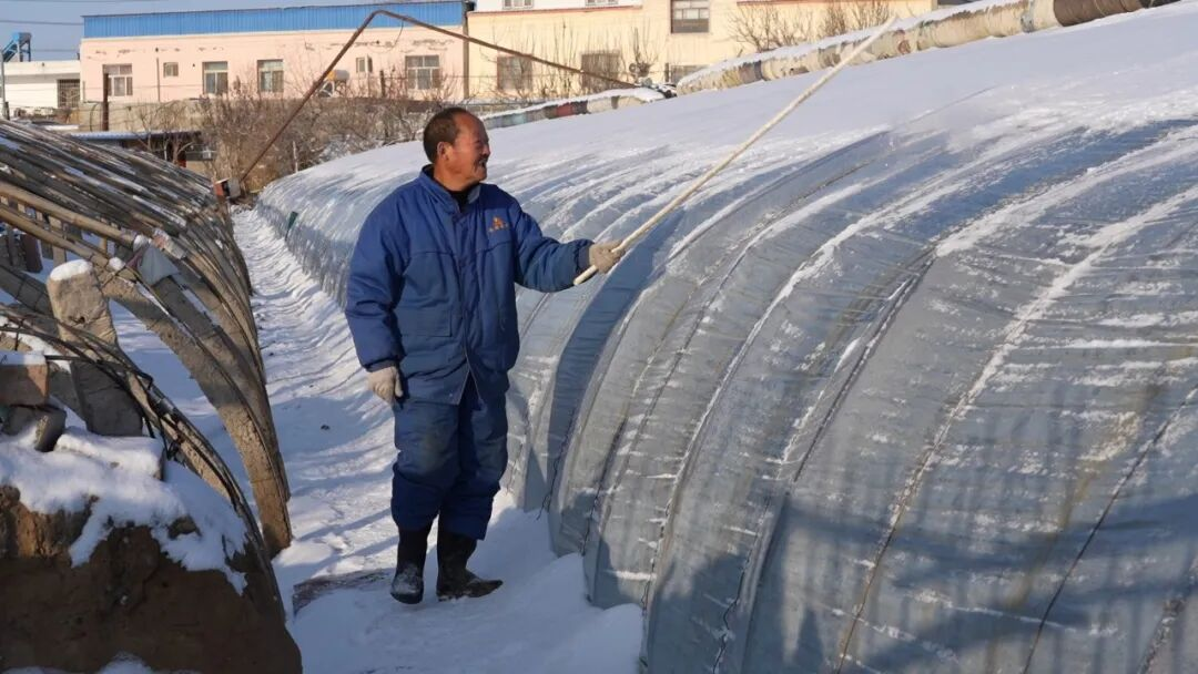 村民正在清理种植大棚顶上的积雪。融媒体中心记者马晶晶摄