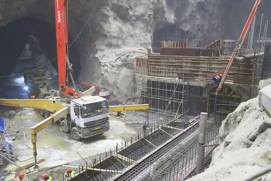 在隧洞主变压器室里,工人们正在进行电缆交通廊道的衬砌,包括整个母线洞底板基础清理和回电混凝土浇筑。