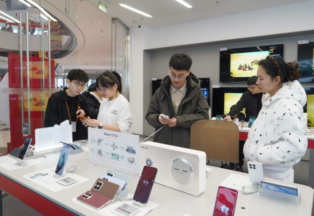 2月4日,记者走进汇嘉时代数码产品专卖店,店内人头攒动,购买数码产品的市民络绎不绝,工作人员正忙着为大家讲解以旧换新补贴政策、演示新品功能。
