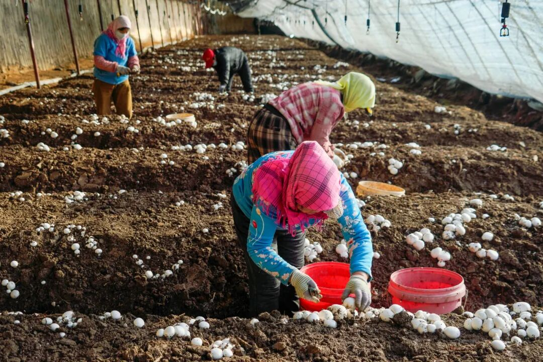 农户正在采收蘑菇。伊州区融媒体中心记者魏国能摄