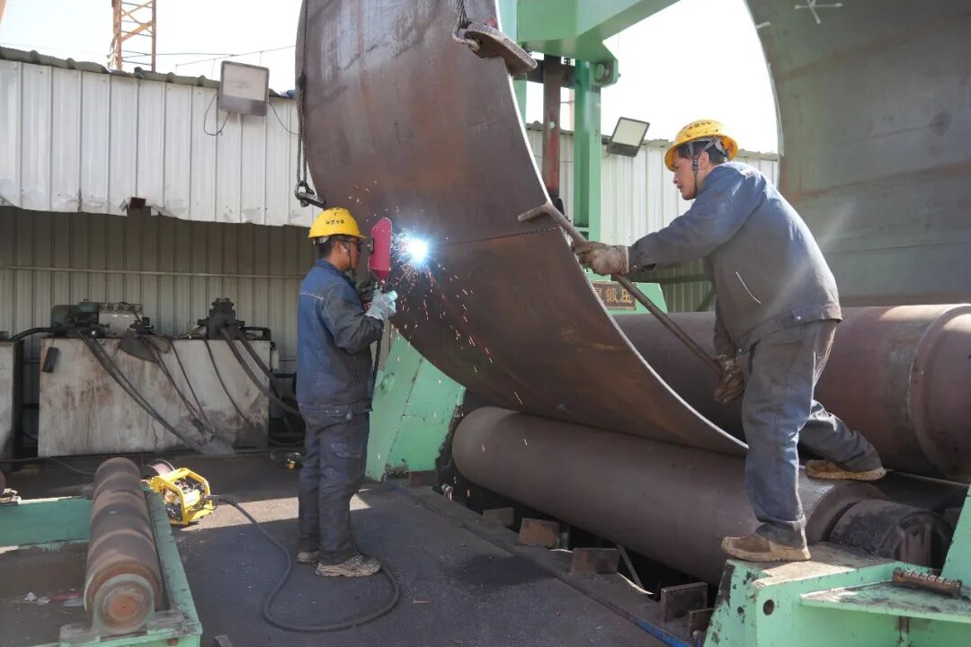 新疆中车新能源装备有限公司技术人员正在焊接钢板。融媒体中心记者杨宏建摄