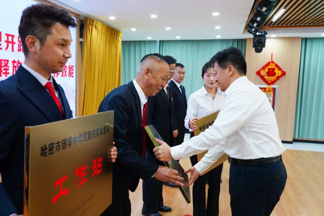 3月26日,市委书记孙涛向5名模范典型颁发“哈密市铸牢中华民族共同体意识工作站”牌匾。哈密市融媒体中心记者李华摄