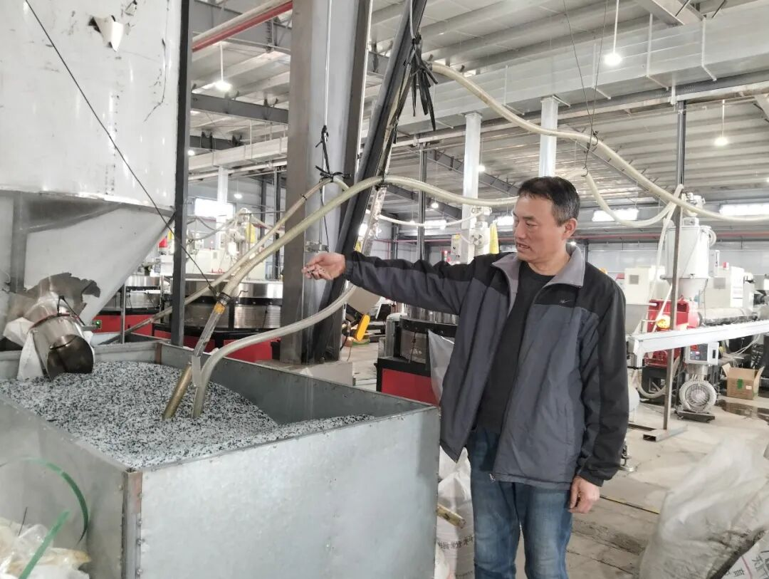 胡旭坤介绍滴灌带生产所用的材料。哈密市融媒体中心记者马志娟摄