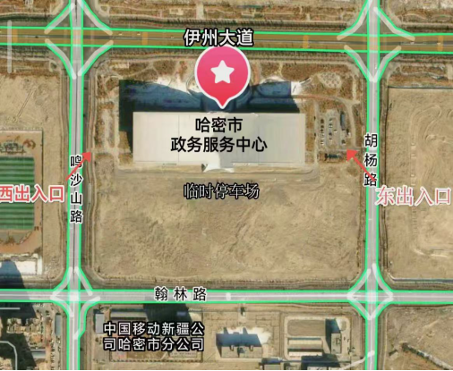 自驾车交通示意图:在各种导航地图APP上搜索“哈密市政务中心”,导航至伊州大道与鸣沙山路交叉口东南200米处,由鸣沙山路、翰林路出入口,驶入哈密市政务服务中心新址临时停车场停车。